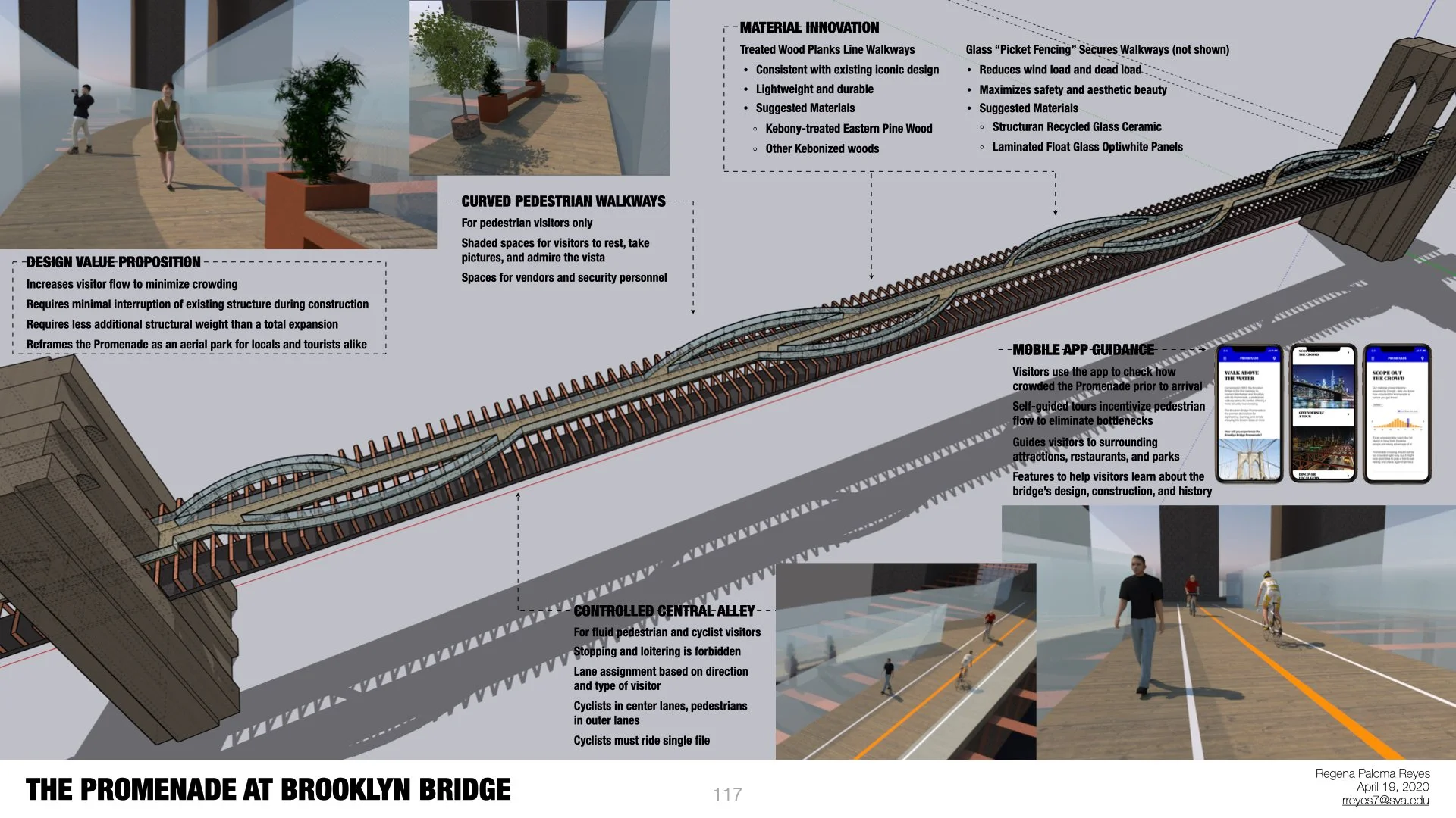 These walkways create spaces for vendors and static pedestrians to take pictures or take a break, while freeing the central alley for cyclists and pedestrians continuing across, dynamically accommodating the varying uses of the existing Brooklyn Bridge Promenade and the surges in visitor traffic that pose safety hazards at present.